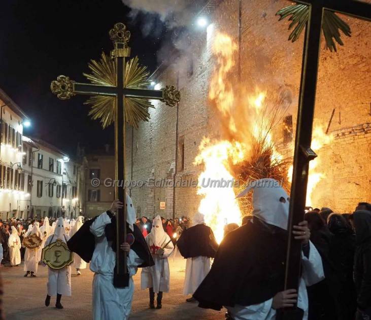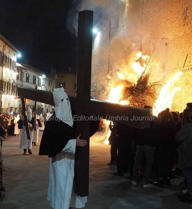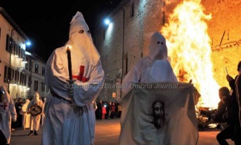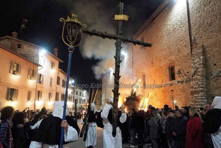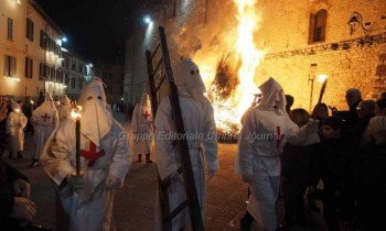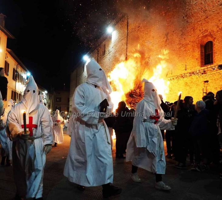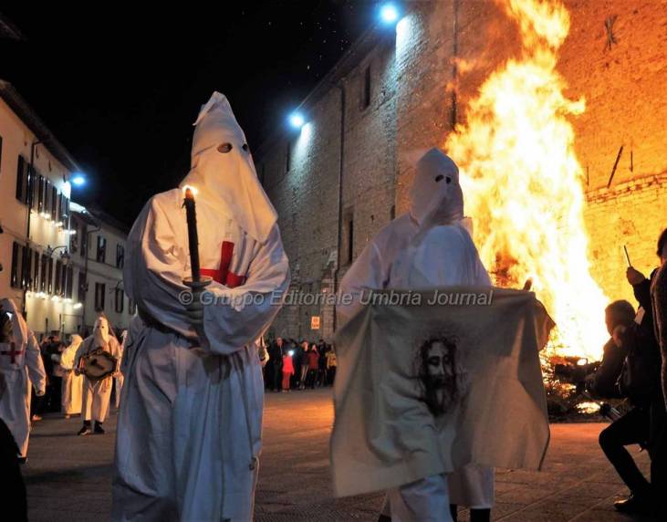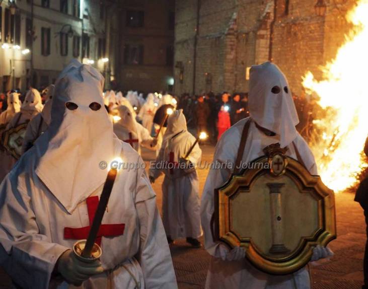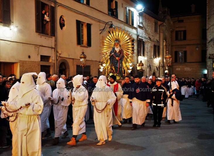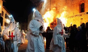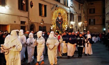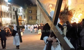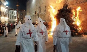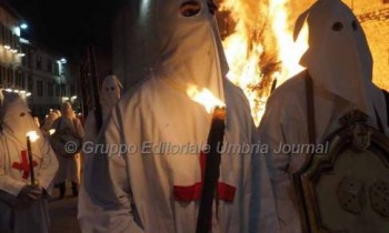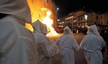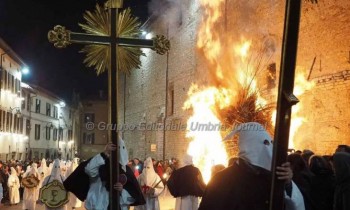 Sempre più suggestiva la cerimonia della secolare processione del Cristo morto a Gubbio. Il corteo, con le statue a grandezza naturale del Cristo morto e della Madonna addolorata, è partito dalla chiesa di San Domenico, accompagnato dagli incappucciati che reggevano i simboli della Passione e i passi scanditi dal suono delle “battistrangole”.
