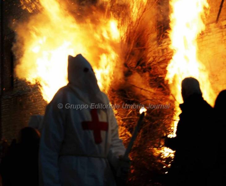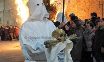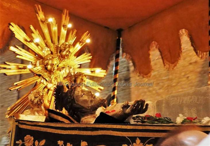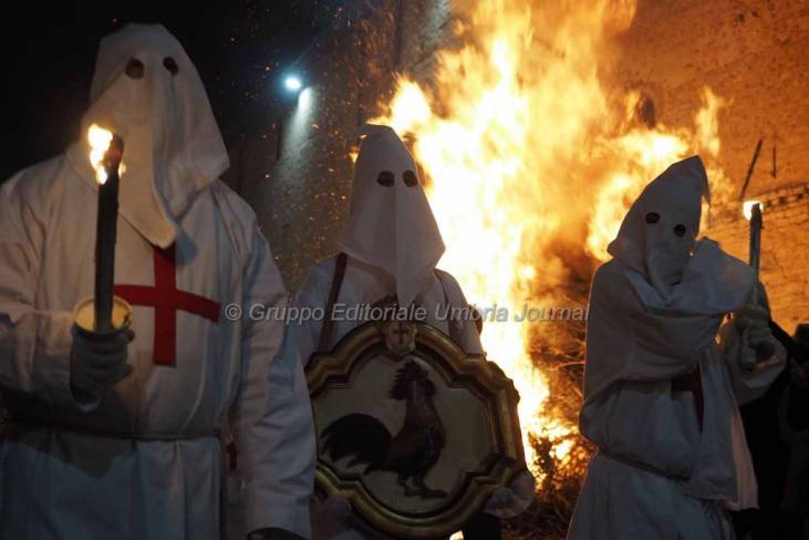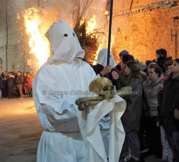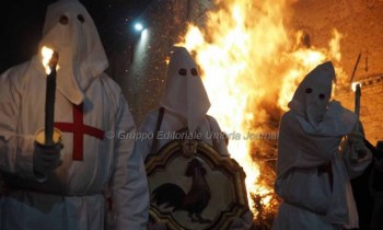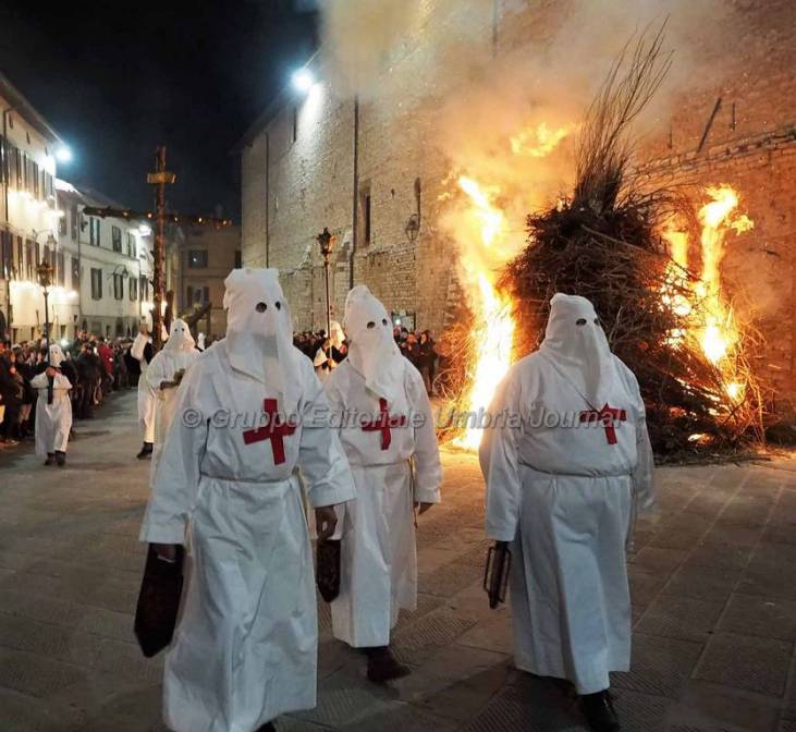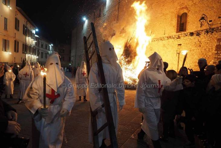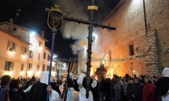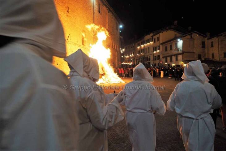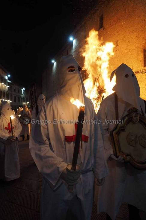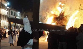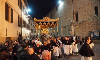 Sempre più suggestiva la cerimonia della secolare processione del Cristo morto a Gubbio. Il corteo, con le statue a grandezza naturale del Cristo morto e della Madonna addolorata, è partito dalla chiesa di San Domenico, accompagnato dagli incappucciati che reggevano i simboli della Passione e i passi scanditi dal suono delle “battistrangole”.
