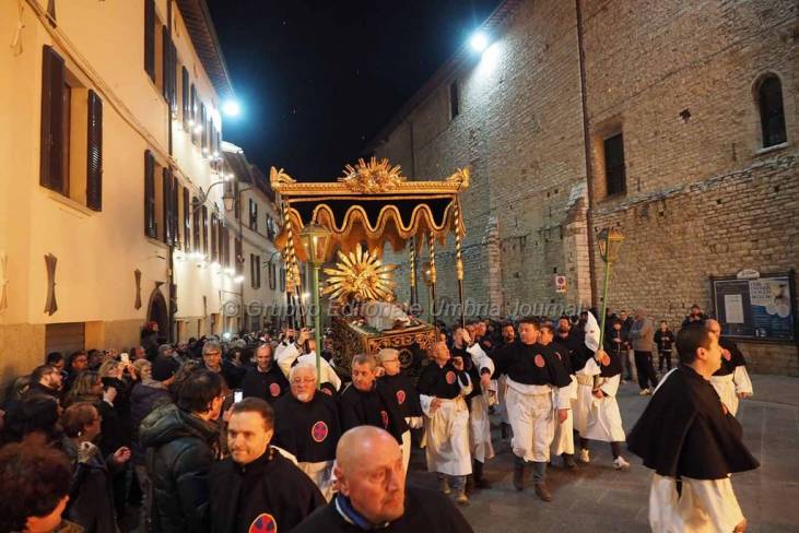 La processione, dalla chiesa di San Domenico, si è diretta verso il quartiere storico di San Martino, dove è stata fatta la consueta prima sosta, sul “pietrone”. A seguire il corteo ha fatto ritorno a San Domenico, poi in via Cavour, piazza Bosone, con sosta alla casa di riposo Mosca, piazza Quaranta Martiri, via Perugina fino al mausoleo e ritorno. Presenti il vescovo Ceccobelli e le autorità civili, militari e religiose.