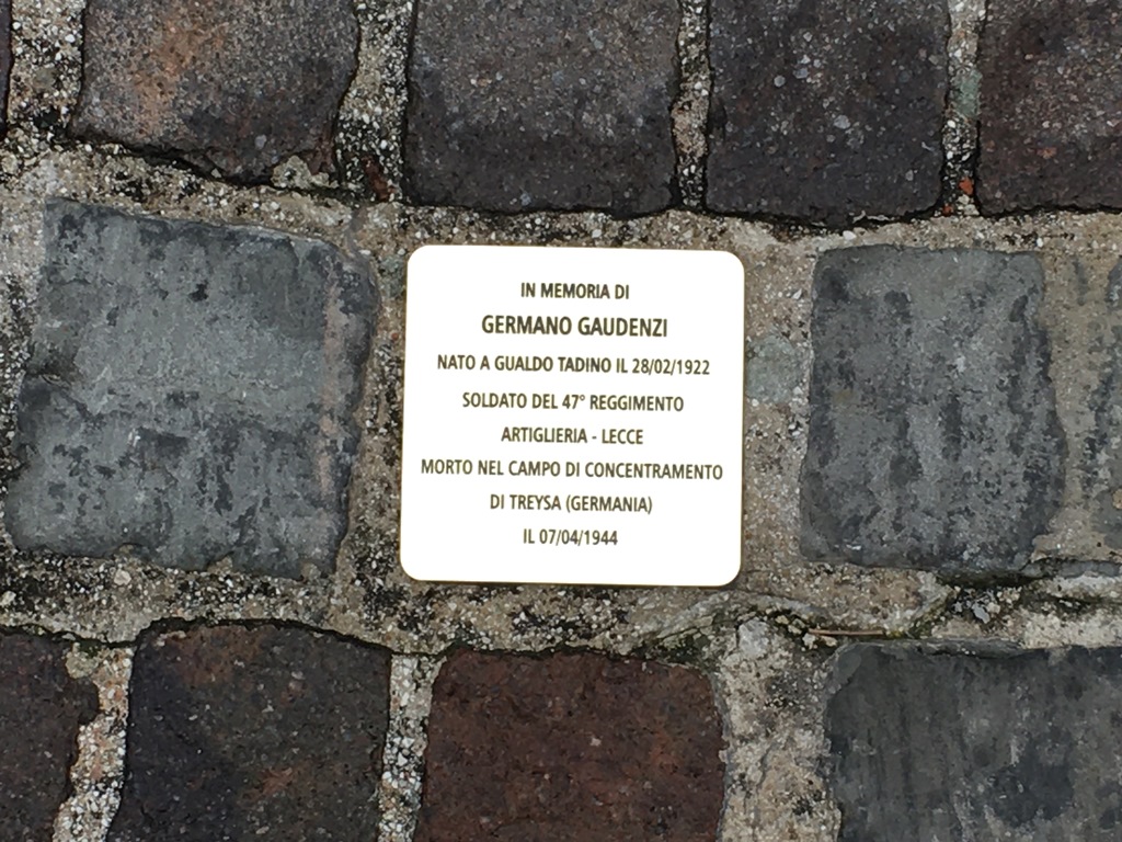 Germano Gaudenzi era nato a Gualdo Tadino il 28/02/1922, era partito per la guerra in Francia dove è stato catturato dai tedeschi che lo hanno deportato in Germania e dove è morto per malattia il 07/04/1944 a Treysa. Era un soldato che faceva parte del 47° Reggimento Artiglieria – Lecce.