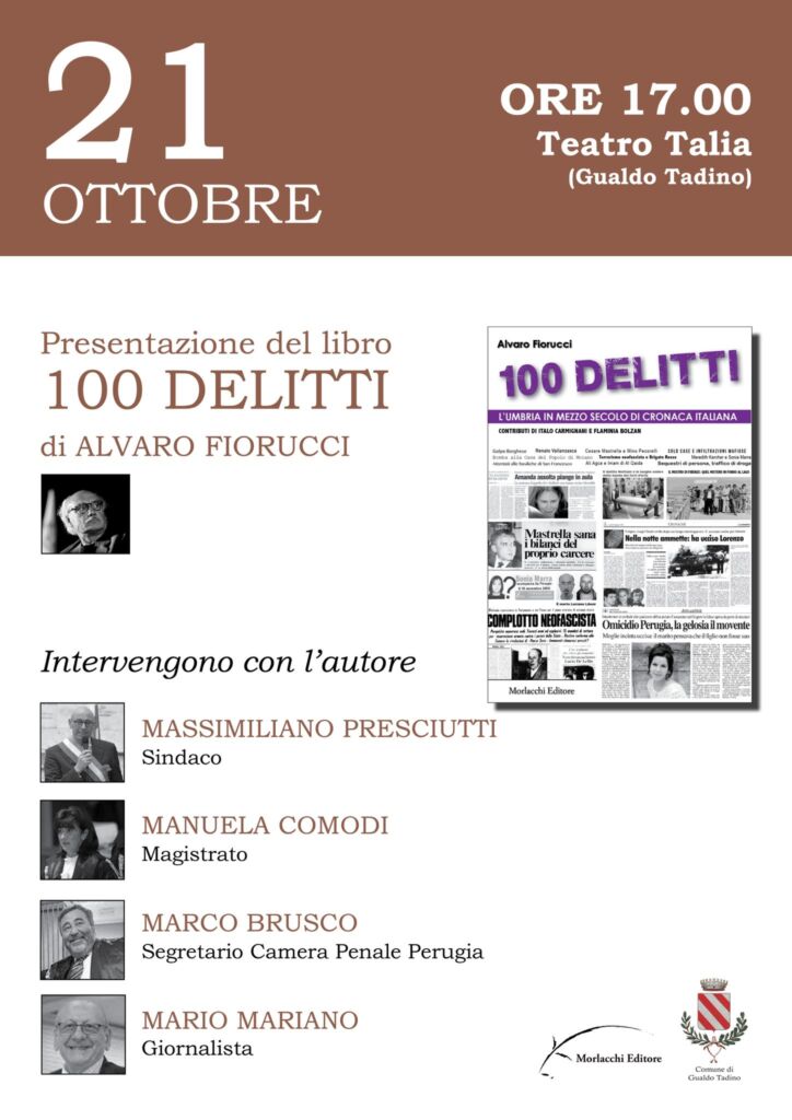 Sarà presentato giovedì prossimo alle ore 17 presso il Teatro Talia di Gualdo Tadino il libro di Alvaro Fiorucci “100 delitti. L’Umbria in mezzo secolo di cronaca italiana” (Morlacchi edizioni).