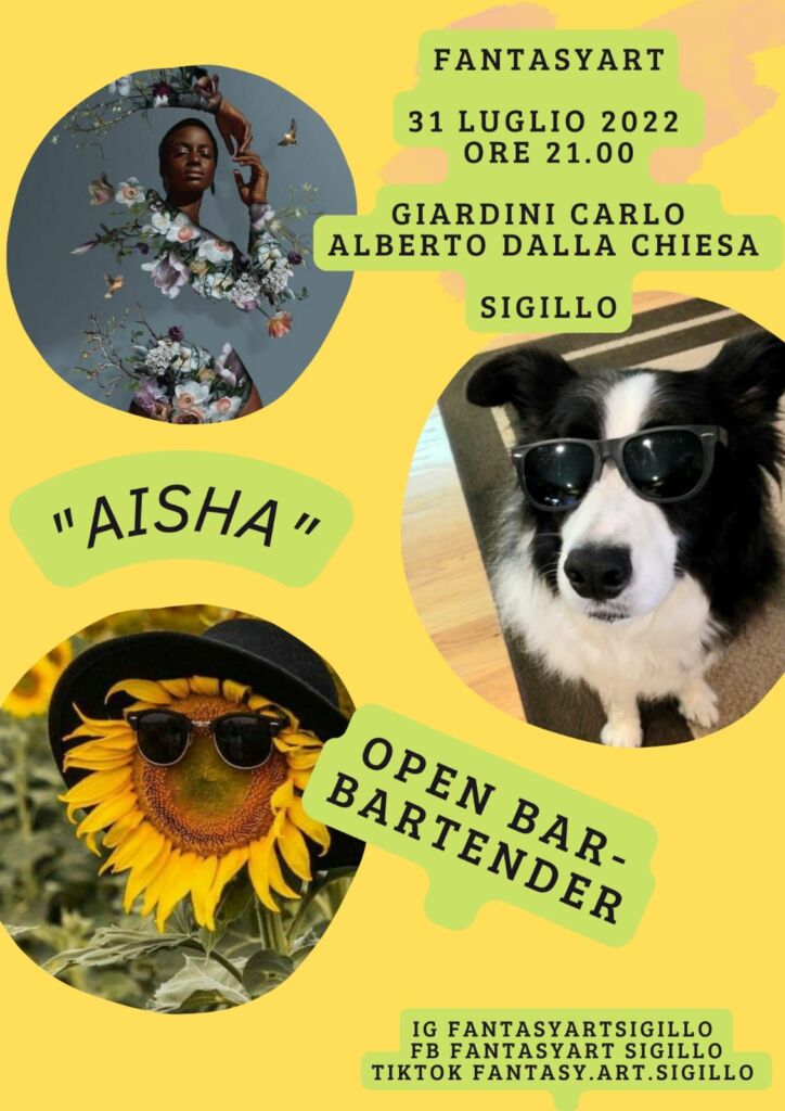 Domenica 31 luglio alle 21, presso i Giardini Carlo Alberto Dalla Chiesa di Sigillo organizza l’evento “Aisha”, al quale parteciperanno anche David Mazzoni, tenore finalista di Italia’s got talent, tanti cantanti, la scuola di danza di Gualdo Tadino “Scarpette rosse”, Seven Tattoo e Loris Cardoni di Gualdo Tadino e Rita Marianalli ed Engles Ercolani di Sigillo, artisti talentuosi che realizzeranno le bodyart.