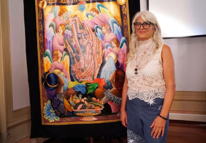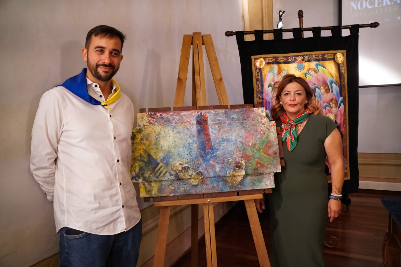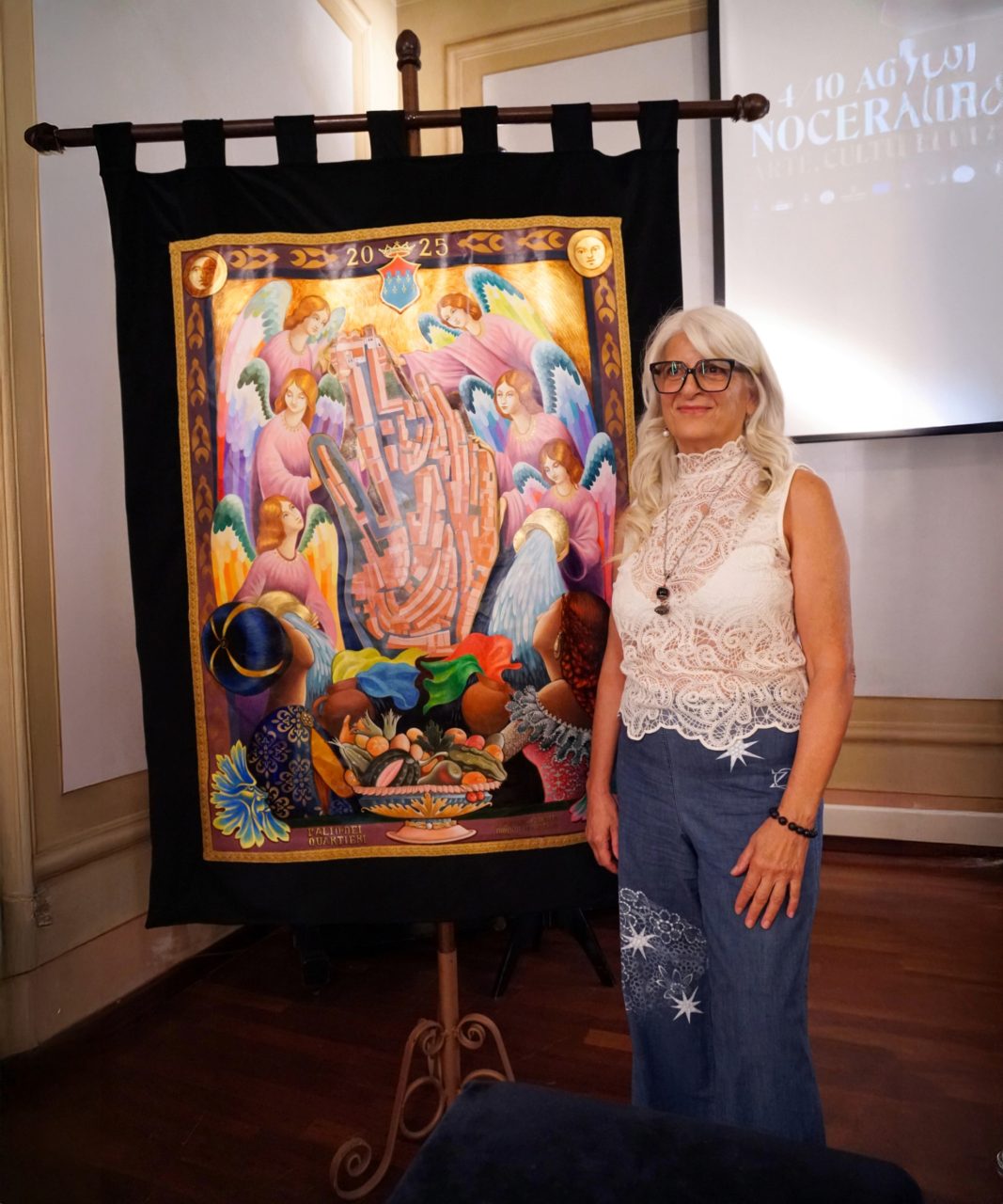 L’artista ha spiegato con emozione di essere stata ispirata da una fotografia aerea della città, che le ha ricordato in modo sorprendente una mano benedicente, con l’indice e il medio puntati verso la cattedrale e il campanaccio, luogo di riposo della salma di San Rinaldo, patrono. Da questa visione mistica, ha deciso di inserire nel disegno le due dame rivolte verso la rappresentazione di Nocera, glorificata dagli angeli, per sottolineare con forza la bellezza intrinseca e la sacralità della città. Patrizia Zingaretti ha firmato con maestria anche il drappo del Palio del Garzoncello, arricchendo ulteriormente il patrimonio artistico della manifestazione.