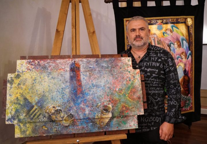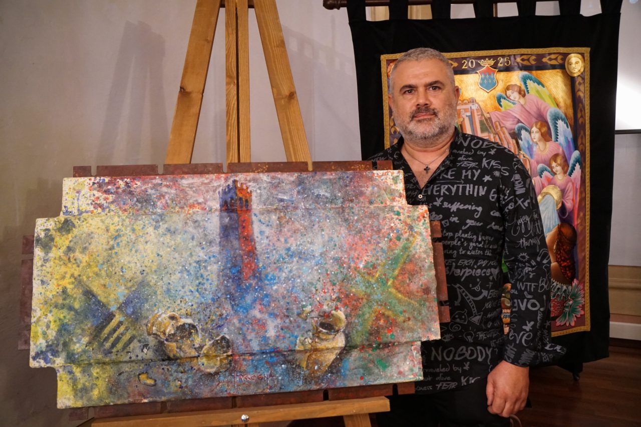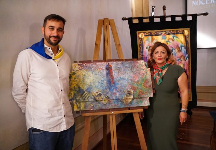 La presentazione di questa mattina ha svelato anche le opere d’arte che diventeranno i simboli tangibili della vittoria e dell’ingegno artistico locale. Il drappo del Palio 2025, così come quelli del Premio Speciale e del Palio del Garzoncello, sono stati mostrati al pubblico per la prima volta, suscitando ammirazione e curiosità. Quest’anno, la creazione del drappo principale è stata affidata all’artista Patrizia Zingaretti, la quale ha realizzato un’opera d’arte mozzafiato, profondamente simbolica. Il suo drappo raffigura una veduta aerea del centro storico di Nocera Umbra, un’immagine suggestiva e dettagliata, portata in trionfo da figure angeliche, mentre sullo sfondo le dame dei due quartieri osservano la scena con evidente estasi e riverenza.