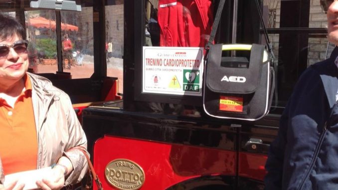 Da oggi si viaggia più sicuri con il ‘Gubbio Express’ cardioprotetto. Infatti, sul  trenino turistico che guida i visitatori in un suggestivo tour attraverso la città storica, in “un viaggio lungo 3000 anni” dalla città romana fino all’acropoli medievale, è stato istallato un apparecchio defibrillatore, offerto dalla ditta Martinelli.  L’iniziativa, realizzata d’intesa con l’associazione “Gli Amici del Cuore”, è inserita nella campagna di prevenzione del rischio cardiaco e la protezione del territorio, nell’ambito del progetto “Gubbio Città Cardioprotetta”. In mattinata,   si è svolta in piazza Grande, la cerimonia di inaugurazione, alla presenza tra gli altri del sindaco Filippo Mario Stirati. Gli operatori  di primo soccorso a bordo del ‘Trenino’, necessari per l’intervento immediato e per l’utilizzo del defibrillatore in attesa del 118, sono stati  formati attraverso un partenariato fra ‘Amici del Cuore’ e ‘Misericordia di Gubbio’.