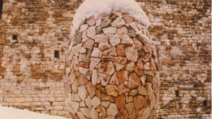 Verrà restituito alla città il prossimo 3 aprile L’Ovo di Gubbio, l’opera di Mirella Bentivoglio oggetto di una importante operazione di restauro e ricostruzione che ha visto insieme Università dei Muratori, Comune di Gubbio, “amici di Mirella” e volontari, al lavoro in queste ore per restituire alla città un pezzo della sua storia.