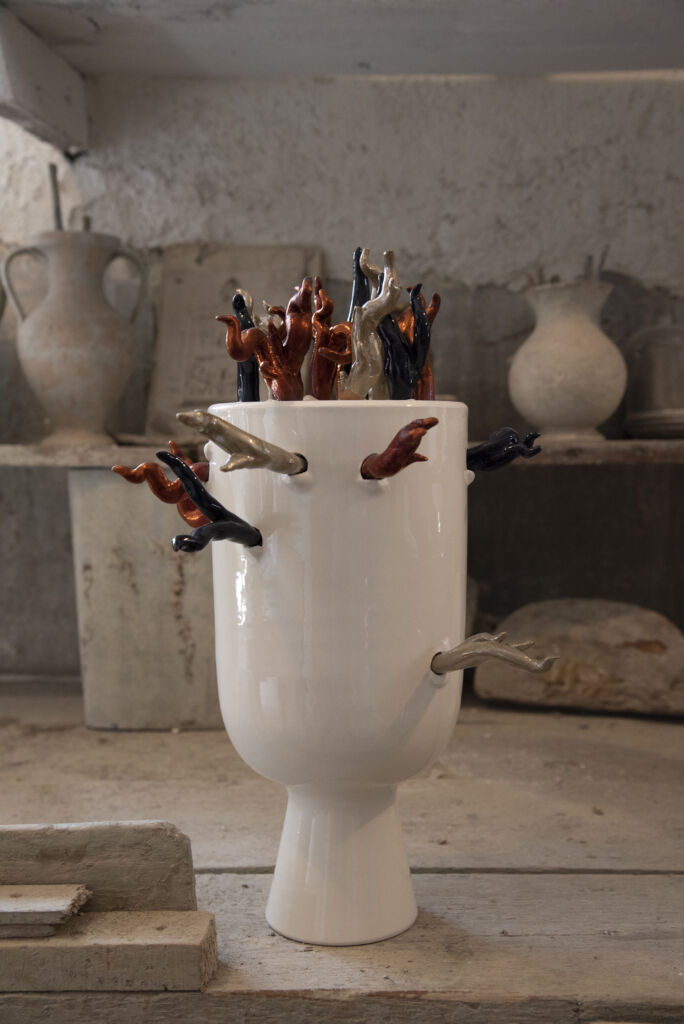 I pezzi lustrati, posti nei vecchi torni, nelle mensole, sui piani di appoggio presenti, dialogano con gli oggetti dell’Opificio, con opere storiche, disegni, sacchetti di colori, forme in gesso.