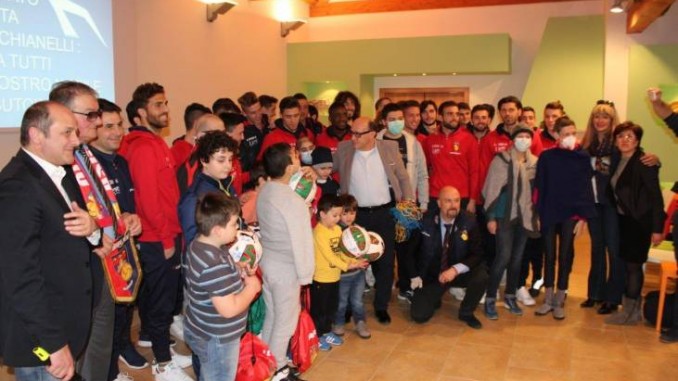 Si sono dati appuntamento all’estate prossima il Comitato per la vita “Daniele Chianelli” e la Gubbio Calcio, per disputare una partita di calcio di beneficenza al Pietro Barbetti di Gubbio. Da questo reciproco impegno, preso in occasione della visita della squadra ai bambini e adulti del Chianelli di Perugia, nascerà in futuro un appartamento all’interno del residence dedicato ai rossoblù.