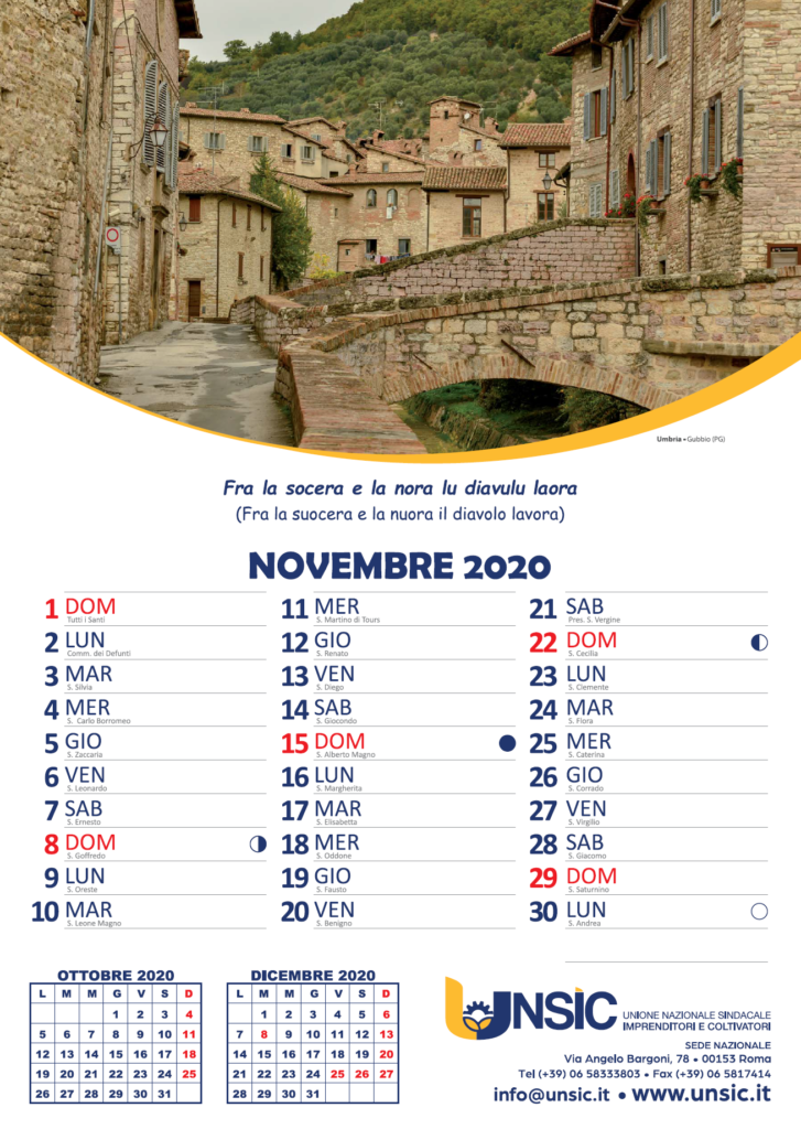Gubbio, con l’immagine del suo meraviglioso centro storico, conquista il calendario 2020 dell’Unsic, il sindacato datoriale con 2.100 Caf in tutta Italia, Umbria compresa (sedi provinciali a Valfabrica e Terni). La bella foto del quartiere San Martino rappresenta degnamente il mese di novembre. Abbinato alla foto c’è un noto proverbio umbro: “Fra la socera e la nora lu diavulu laora”.
