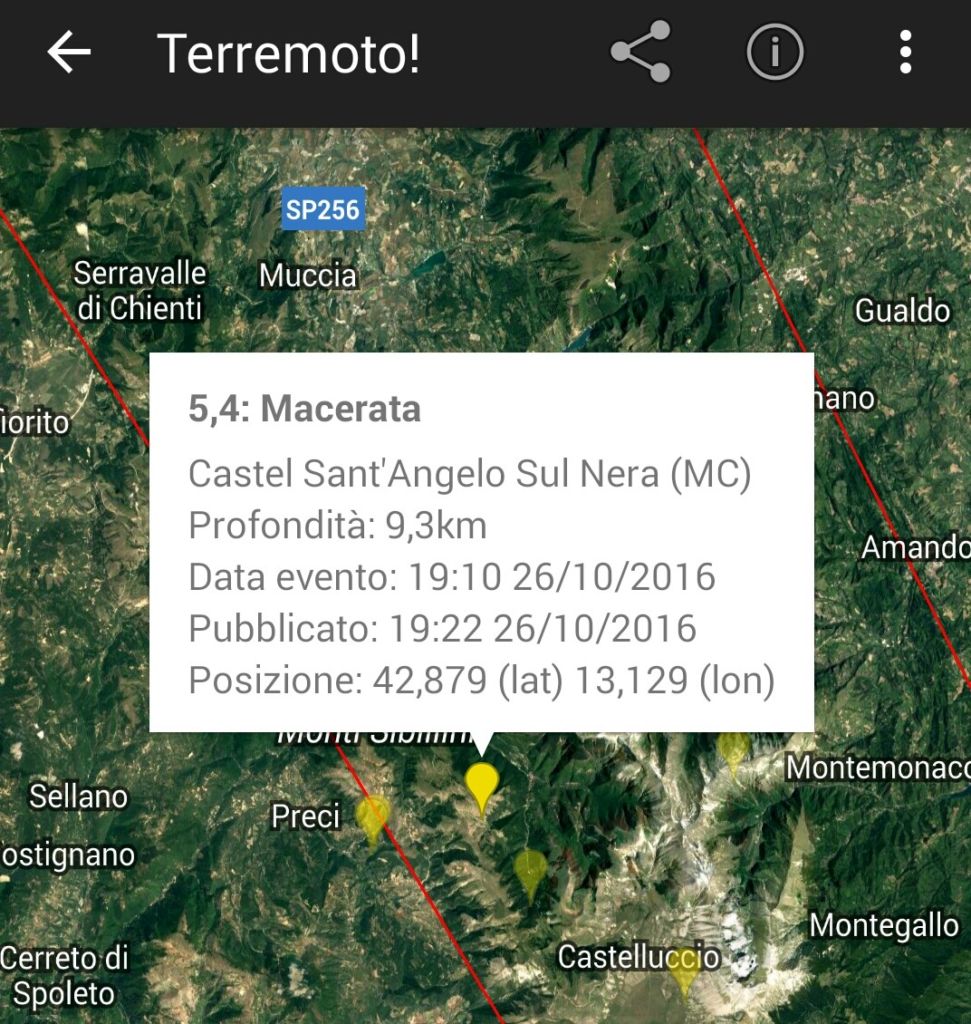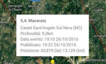 Fortissima scossa di magnitudo 5.4 a Macerata, a Gualdo Tadino gente in strada. Una fortissima scossa di terremoto è stata avvertita dalla popolazione il 26 ottobre 2016 alle ore 19.10. A due mesi dal violenta sisma del 24 agosto, la terra continua a tremare, anzi non si è mai fermata. Il terremoto è stato registrato nella zona compresa tra Perugia e Macerata il centro più vicino è Castel Sant’Angelo sul Nera. Il magnitudo è stato di 5.4 e a una profondità di 9.3 chilometri. Lo ha reso noto l’Istituto nazionale di Geofisica e Vulcanologia (Ingv). Il terremoto è collegato a quello avvenuto il 24 agosto nel Reatino. Lo ha detto il sismologo Alessandro Amato che ha anche spiegato che è avvenuto su un’altra struttura collegata a quel sistema di faglie. Secondo le prime analisi la nuova struttura attivata si troverebbe qualche chilometro più a Nord della faglia attivata il 24 agosto.
