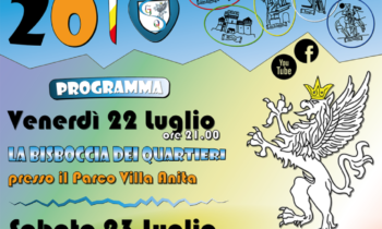Si inizia Venerdì 22 Luglio alle ore 21.00, presso il Parco Villa Anita di Sigillo, con “La Bisboccia dei Quartieri”, versione tutta “sigillana” delle classiche taverne, per poi proseguire Sabato 23 Luglio alle ore 21.00, presso lo Stadio Comunale “Ermes Aretini” di Sigillo, con l’attesissima edizione numero sedici dei “Giochi di Quartiere”.