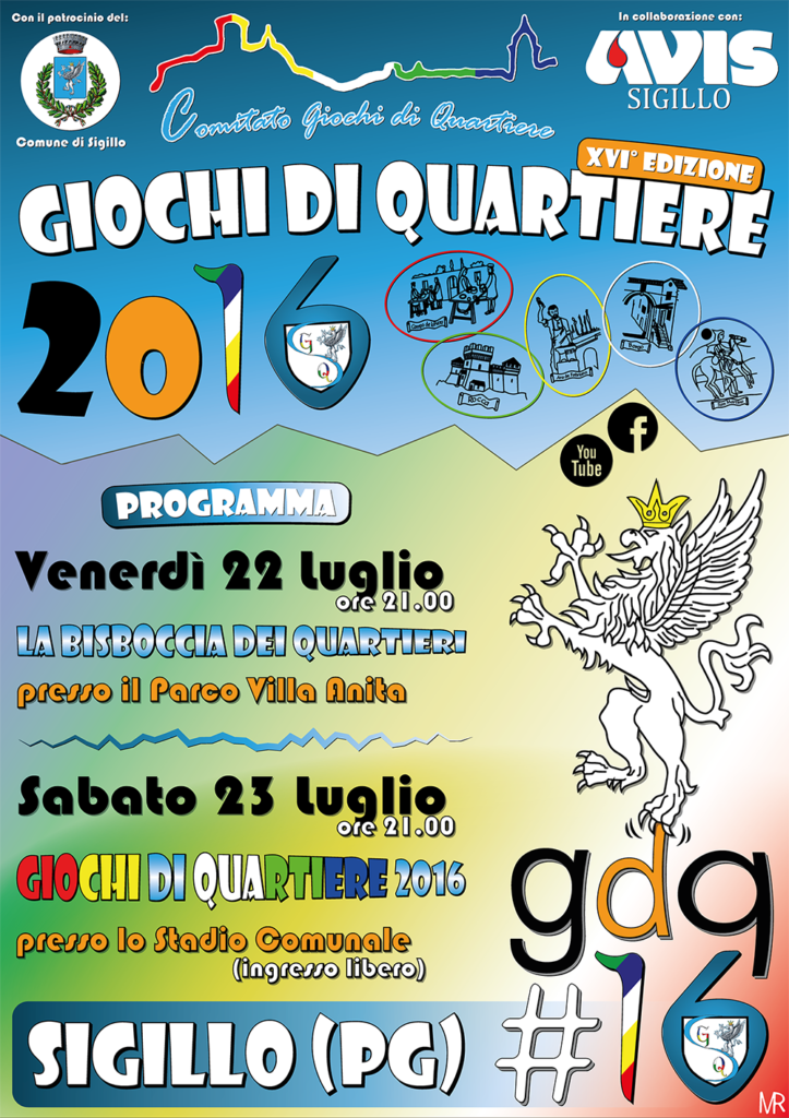 I “Giochi di Quartiere” colorano Sigillo. I “Giochi di Quartiere” nascono ufficialmente nel 1992, dall’idea di un gruppo di ragazzi dell’allora Pro Loco di Sigillo, in occasione della Festa della Patrona Sant’Anna che si celebra il 26 Luglio.