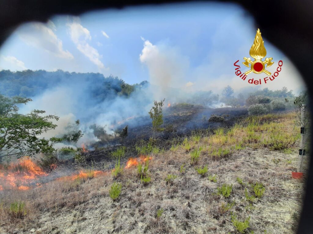 Le fiamme, che hanno interessato un vasto campo ricoperto di stoppie ed arbusti, rischiano di espandersi in un vicino bosco.